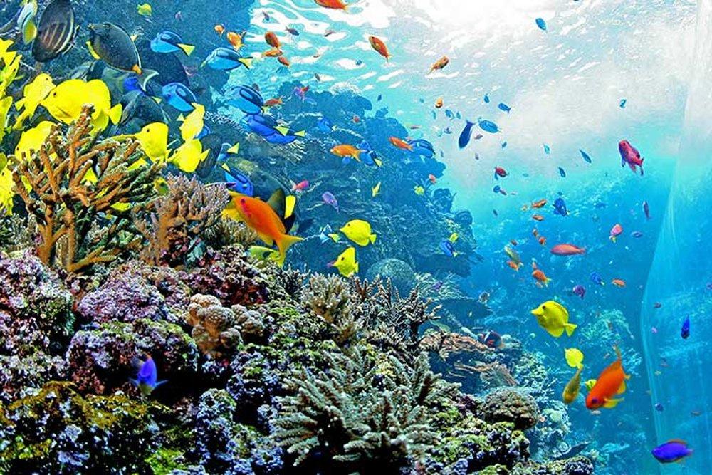 Una fiel recreación de un arrecife de coral tropical del Pacífico presenta corales vivos y miles de coloridos peces de arrecife.